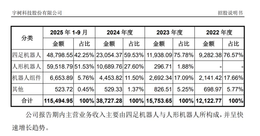 报告期内,宇树科技主营业务收入由四足机器人与人形机器人所构成。2022年、2023年、2024年以及2025年1—9月,四足机器人收入占比逐步下降,从76.57%降至42.25%,人形机器人收入占比逐步提升,从2023年占比1.88%,到2025年1—9月达到51.53%。